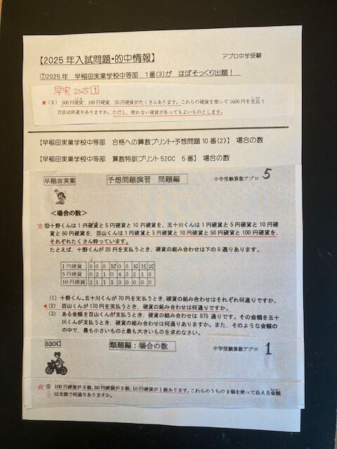 【7月まで早割】<PDF送信>早稲田実業学校中等部 2027年合格算数プリント ★2025年入試的中!
