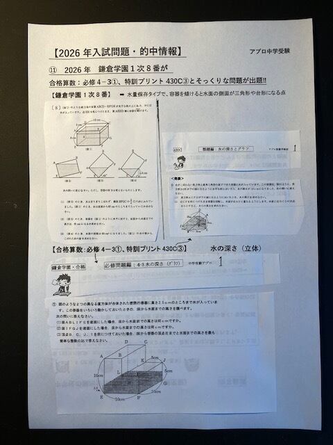 2026年 鎌倉学園中学校一次入試8番が、合格算数:必修4-3①と算数特訓プリント430C③にそっくり出題(水の深さ・立体)。