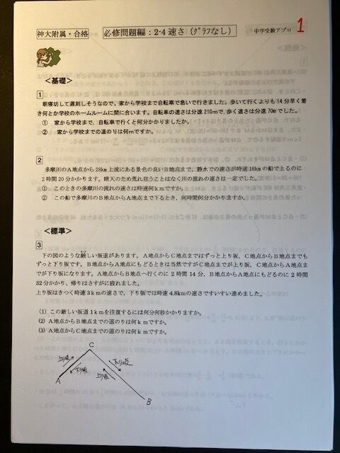 2026年入試的中!神大附属1回・2回2番(3)が算数特訓プリント240Gの5・6番にほぼそっくり出題:速さ(流水算)
